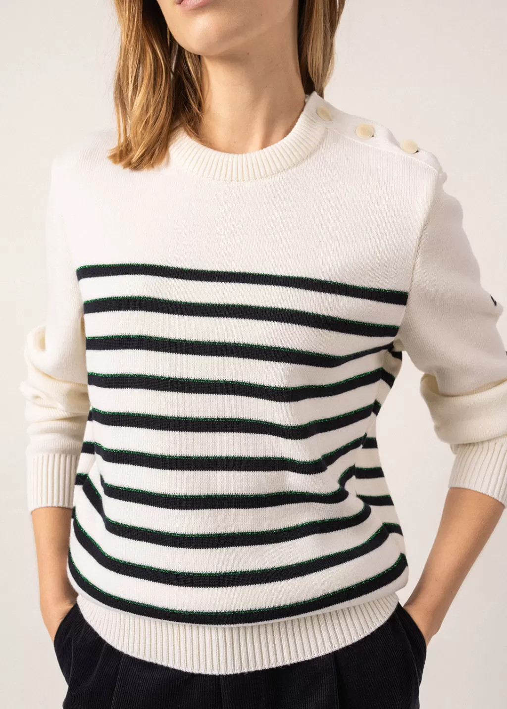 Modern, the Verdon jumper is inspired by our traditional sailor jumpers and offers a reworked, original version. It retains traditional attributes of the model: the 1×1 rib knitting, the shoulder buttoning, as well as the round collar. But its iconic stripes concentrate on the body, leaving the sleeves plain, except for a striped elbow patch, in a rectangular format. An original yet subtle model, enhanced with a touch of lurex in the stripes.- Striped jumper