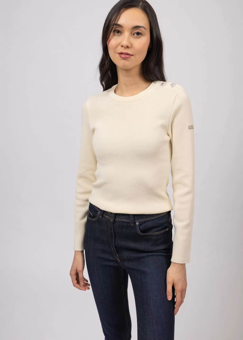 Lighter and softer than the authentic sailor jumper, the Marée jumper still features all its iconic charactesristics : slim fit, round neck and shoulder buttoning. A timeless, elegant piece.- 1×1 rib knit