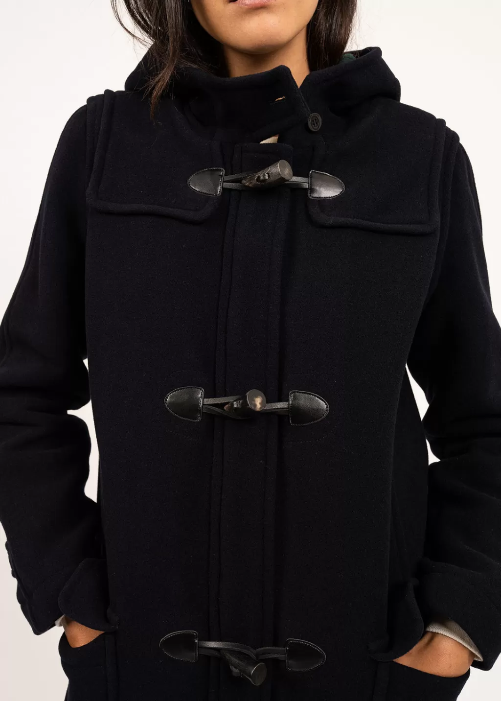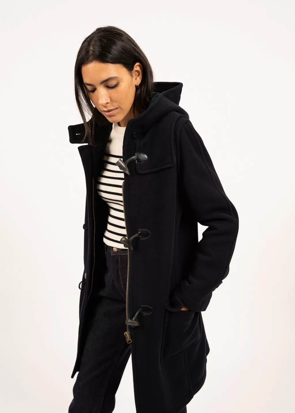 Wool duffle-coat, check interior. Shoulder panels. Zip fastening with horn toggles and leather loops. Patch pockets, inner patch pocket with button. Cuff : button tab. Inner : biais band.- Regular fit