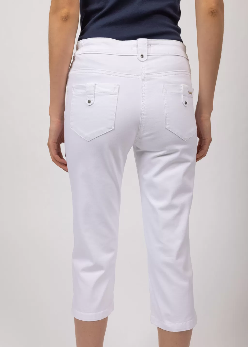 Three quarters pants in gabardine. Western pockets and patch pocket at the back. Elastic waist on the sides. Decorative eyelets. Splits at the bottom of the legs.- Gabardine