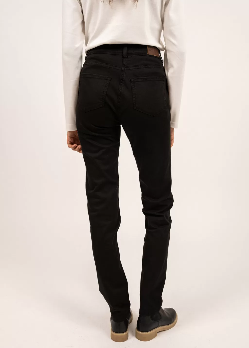 5 pocket, high waisted trousers. Slanted back pockets. Striped poplin at bottom of pockets. Metal button witg anchor detail.- Slim fit