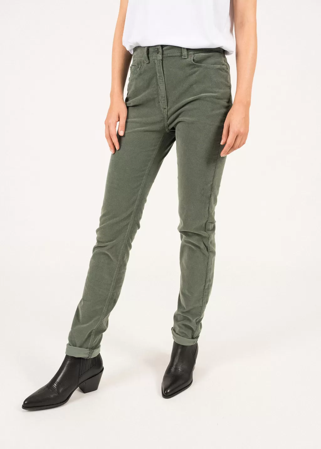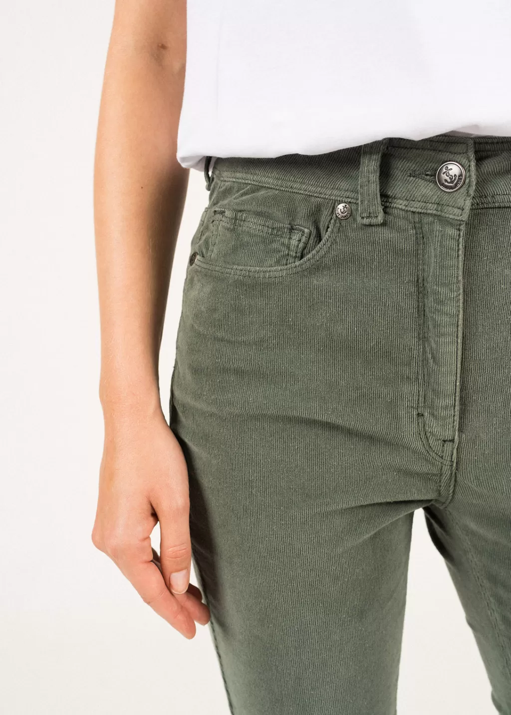 High waisted, 5 pocket trousers in striped velvet. Slanted back pockets. Bottom of pockets in striped poplin. Metal button with engraved anchor detail.- Velvet