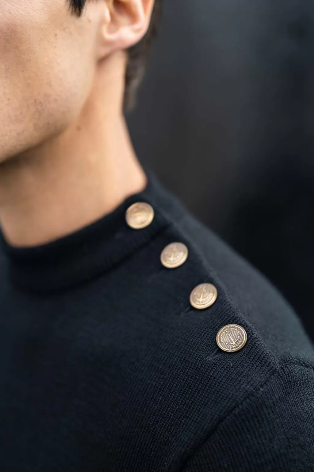 With the black version of the Compas jumper, immerse yourself in the world of French Navy submarine forces. The black and gold “Submarine Forces” felt patch gives all its character to this pure wool garment which features all the codes of the sailor jumper: remeshed round neck, cuffs at the bottom of the sleeves and old gold “National Navy” buttons on one shoulder.Made in France.- Authentic sailor jumper