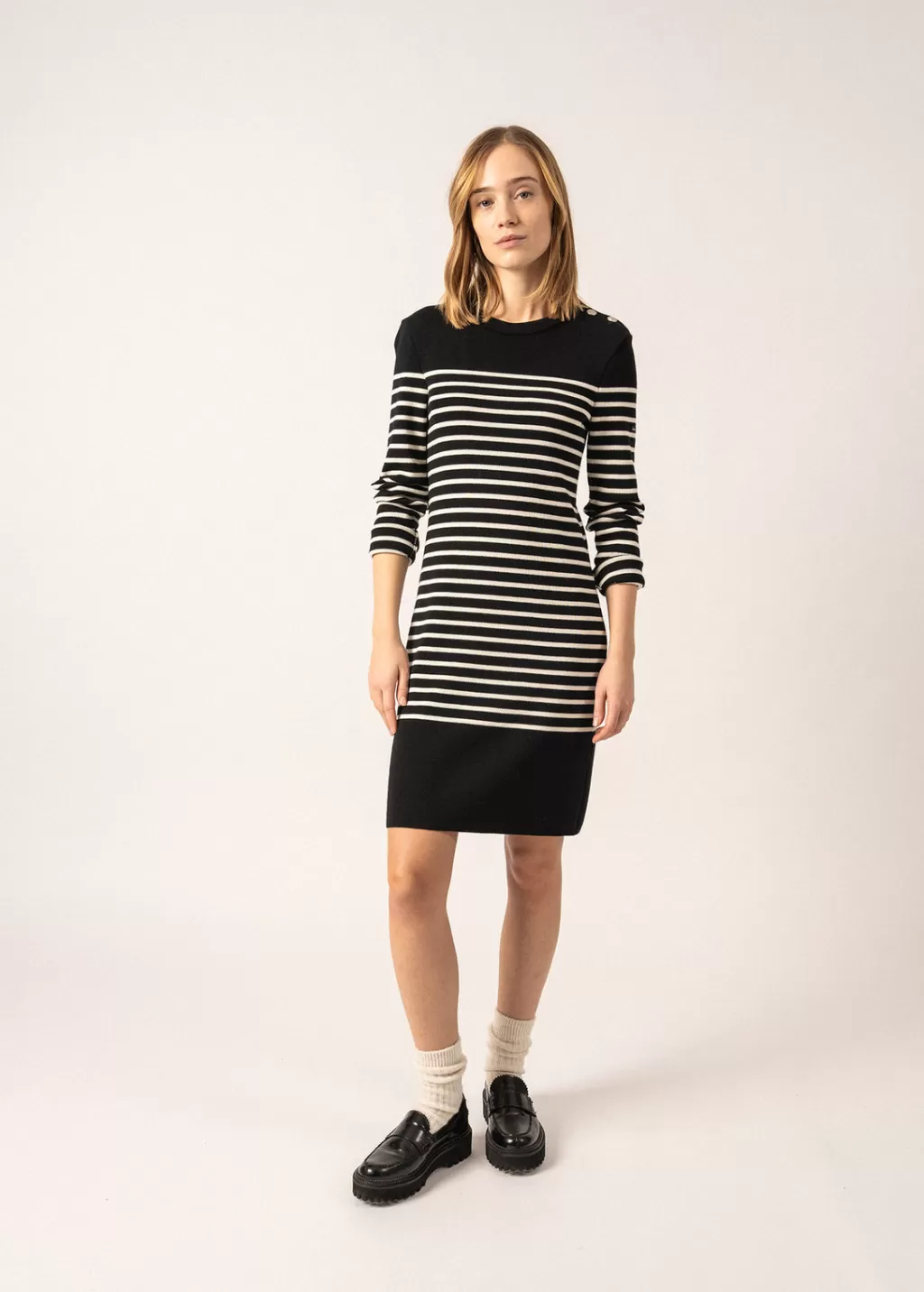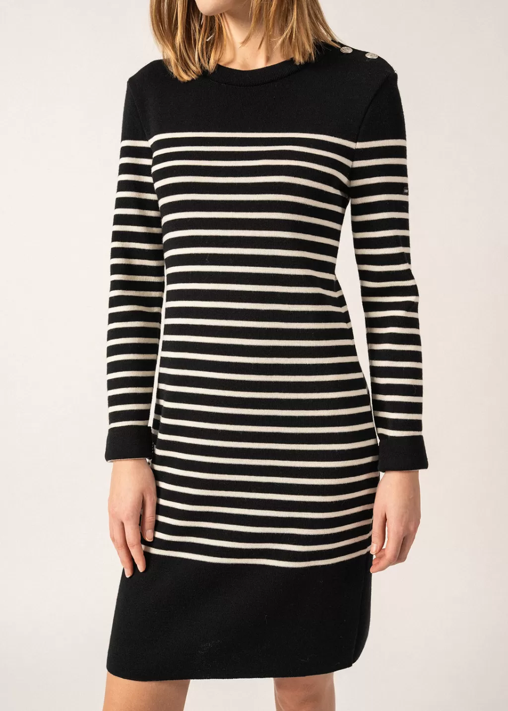Knitted in our Atelier, the Grande Marée striepd dress is made in merino wool. Inspired by our iconic sailor jumper, it is a timeless, elegant piece, for a feminine look.- 1×1 rib knit