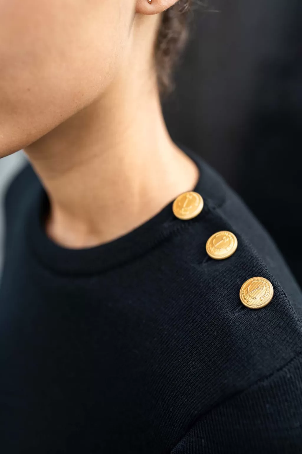Inspired by traditional sailor jumpers in virgin wool, the Astrolabe model is a more feminine and softer version, made in merino wool. Authentic, the Astrolabe jumper has a remeshed round neck and buttoning on the shoulder, characteristic of traditional sailor sweaters.