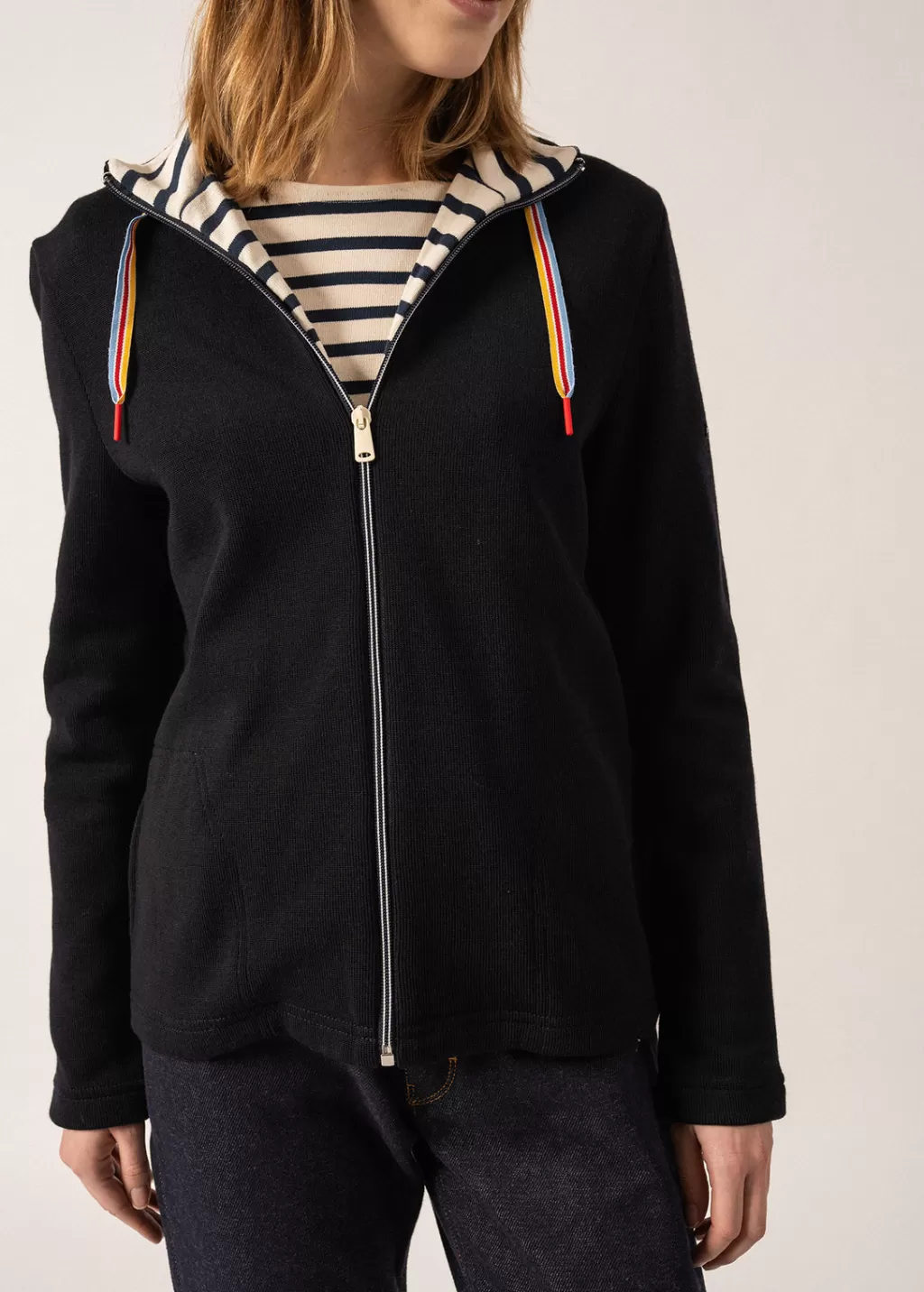 Designed in a double-faced system combining the elegance of wool on the outside and the comfort of cotton on the inside, the Voiron cardigan is a sweatshirt-inspired, zipped cardigan. We love the detail of its colourful tie, as well as its striped addition inside the neckline.- Vest