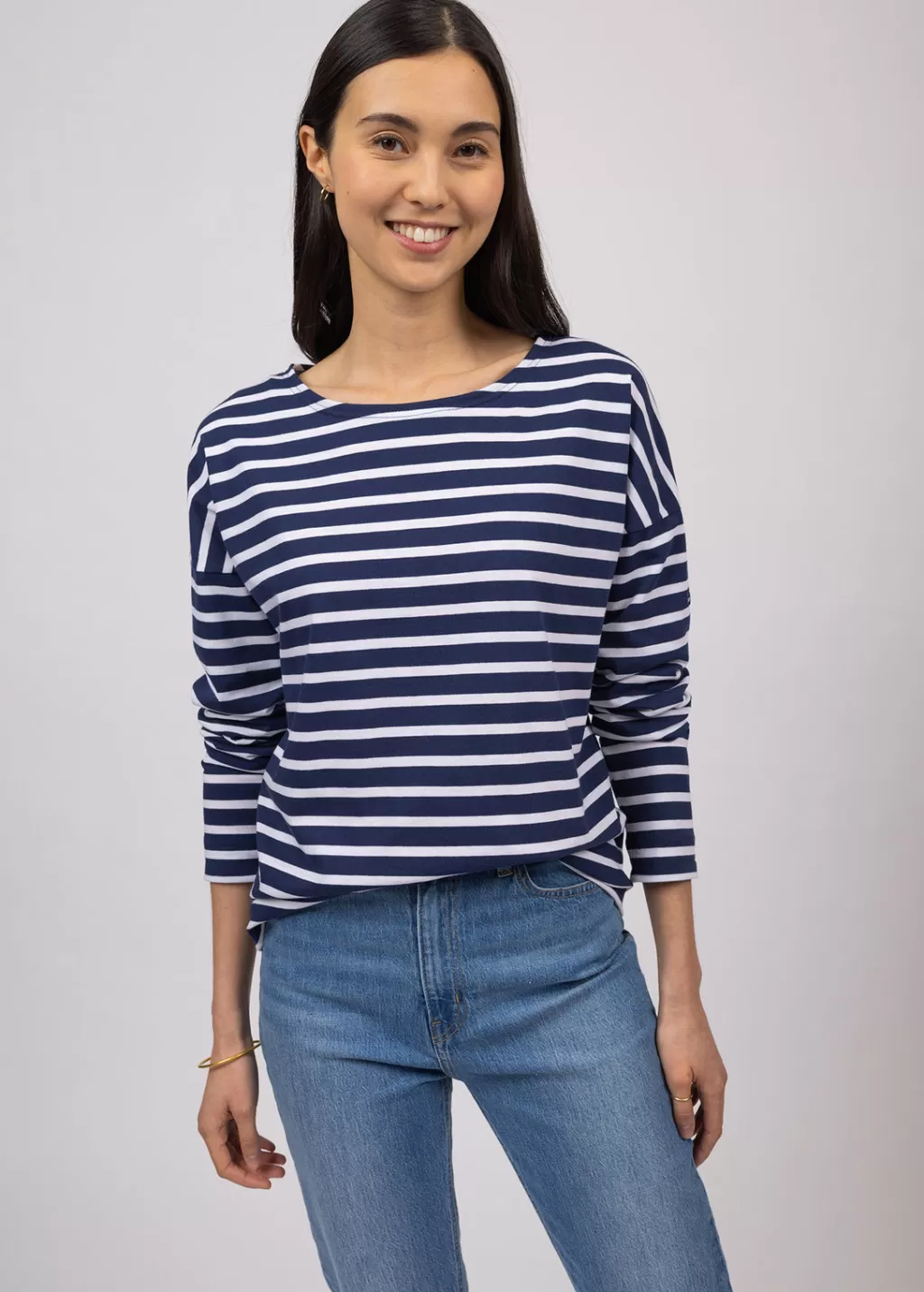 Modern and casual, the Minquiers Drop sailor striped shirt is inspired by our iconic Minquiers. This design features a dropped shoulder, which brings volume and modernity. Perfect for those looking for a comfortable piece, with a larger fit.- Jersey