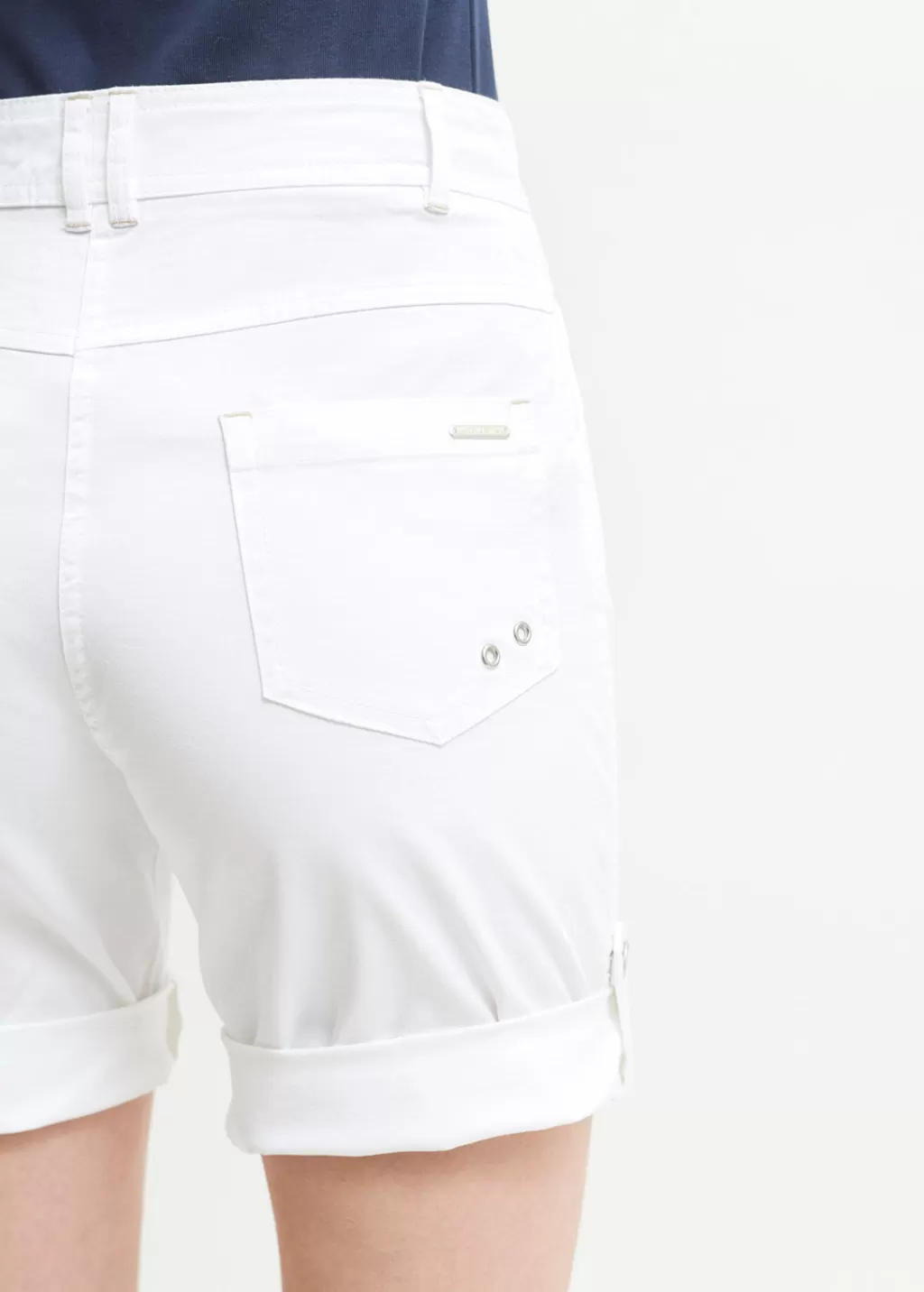 Gabardine Bermuda shorts. Fancy line cuts. Buttoned tab on lower leg to shorten the Bermuda shorts. Double belt loops. Decorative eyelets on pockets.