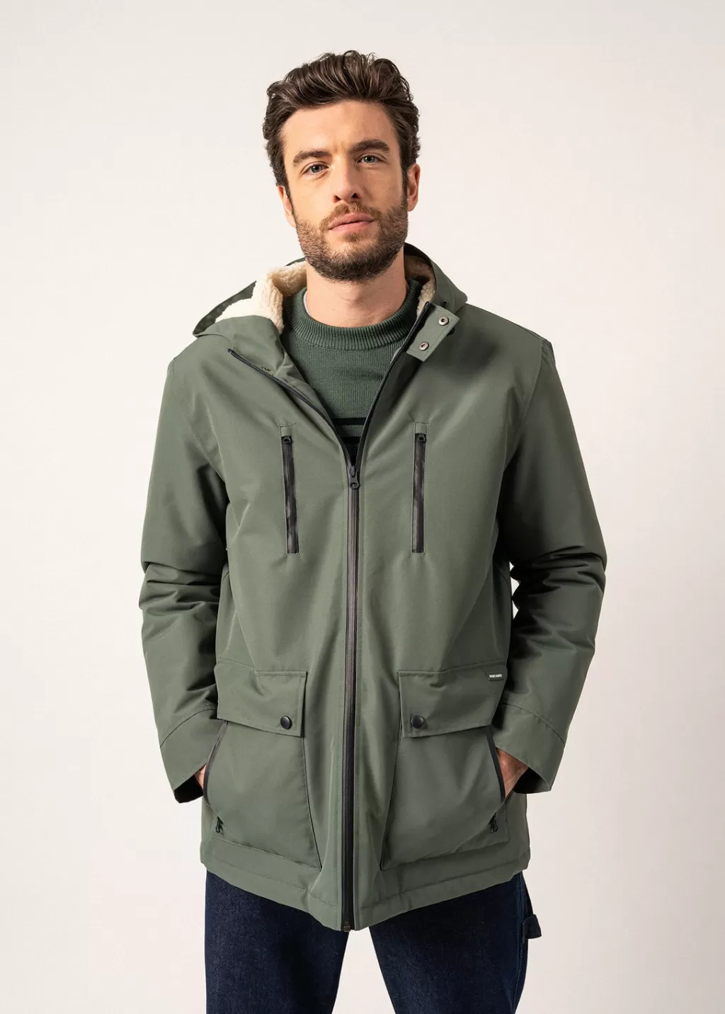 Waterproof, the St Gaetan parka is great for dealing with bad weather and the cold of winter. Lined in Sherpa, it will bring you comfort and warmth. We love the detail of its double pocket, ideal for keeping your hands warm while carrying your personal items easily, as well as its contrasting details inside the garment.- Coat in waterproof canvas