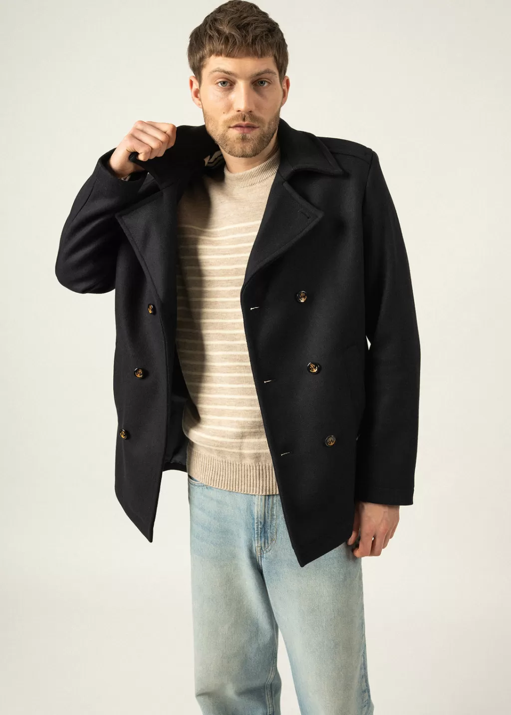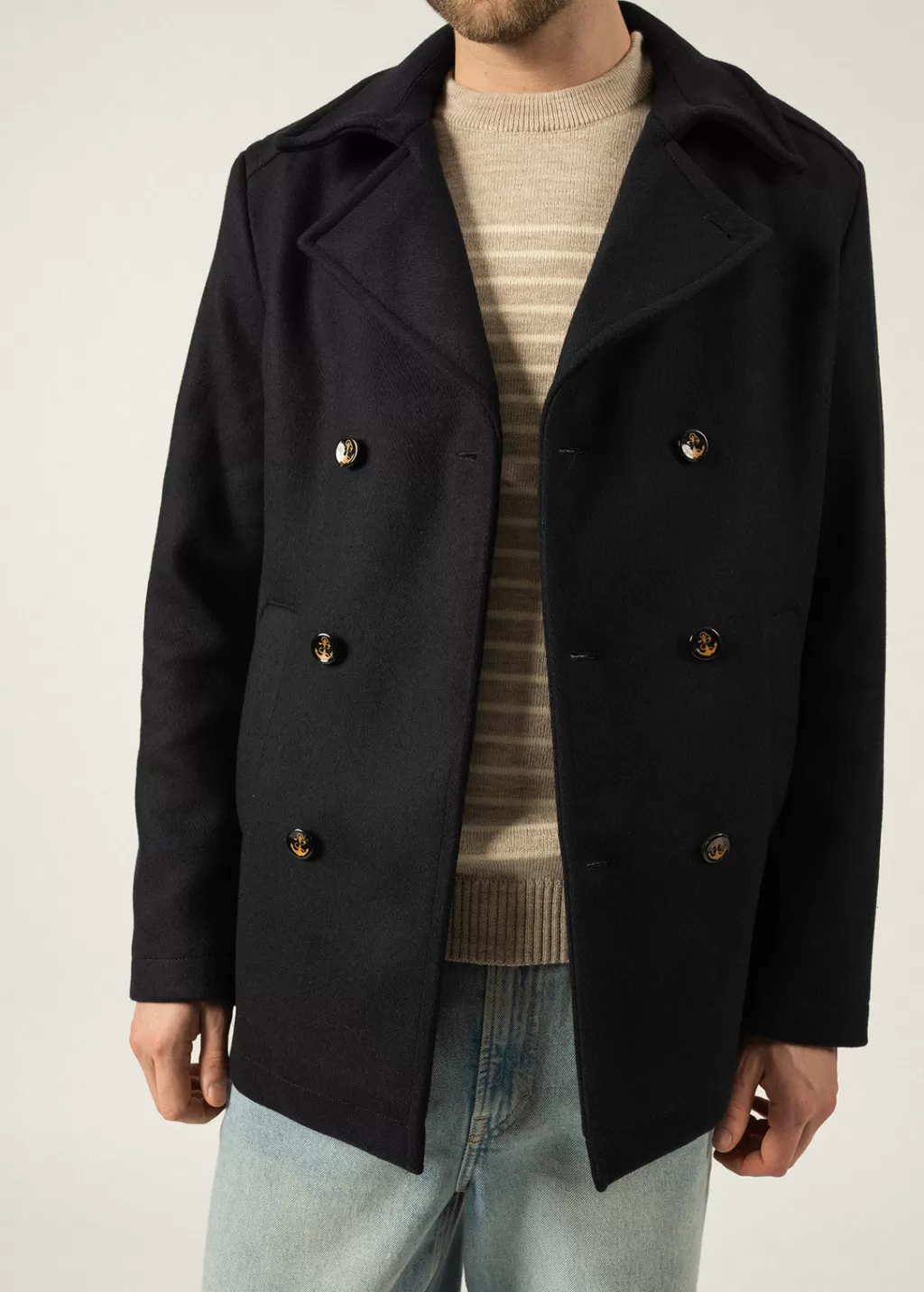 With the St Hilaire piece, the traditional peacoat enters the era of modernity. Tighter and shorter than our classic designs, it features a more urban look, while keeping up with our timeless codes. Made in wool cloth, it keeps the authenticity of our peacoats. On the inside, a striped yokes enhanced the piece and remind us of our timeless sailor striped shirts.- Wool cloth