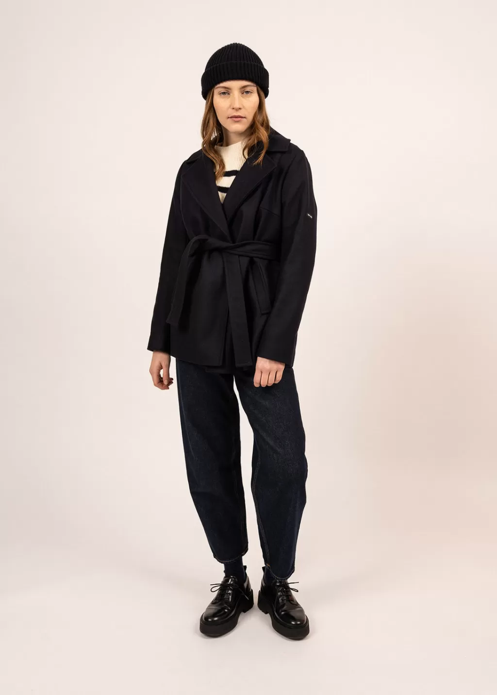 Made in woolen cloth, the Ste Laury coat is a short, belted coat. Sober, elegant and feminine, it is an ideal piece to match your winter outfits. A little fantasy: its coat of arms buttons are made from recycled scallop shells and sugar cane sugar, a first at SAINT JAMES!- Coat in woollen fabric
