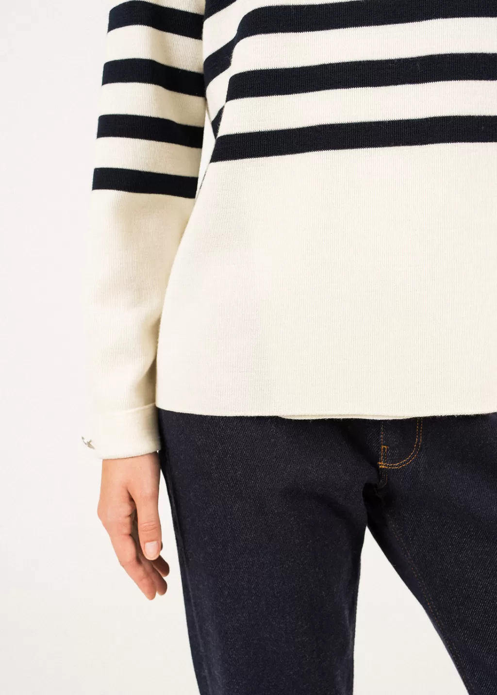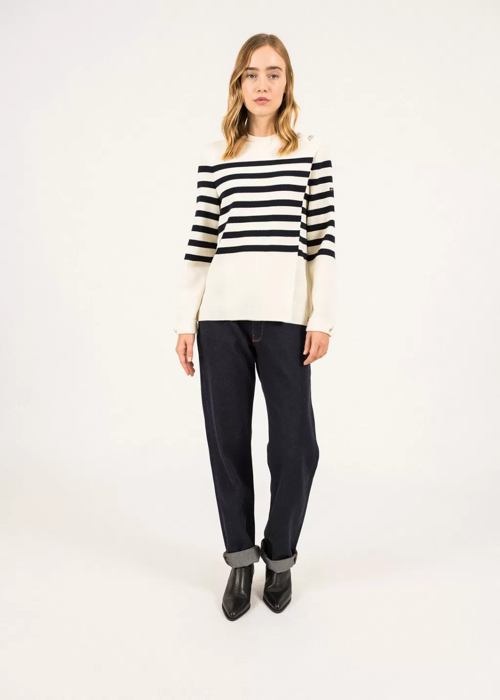 Every season, Norman stylist Romain Brifault plays with our maritime codes and proposes feminine and elegant variations of our iconic stripes and traditional marine jumpers. The Docks model is a marine-inspired jumper, with a trompe l’oeil effect on the front with its large folded panel.- Jumper