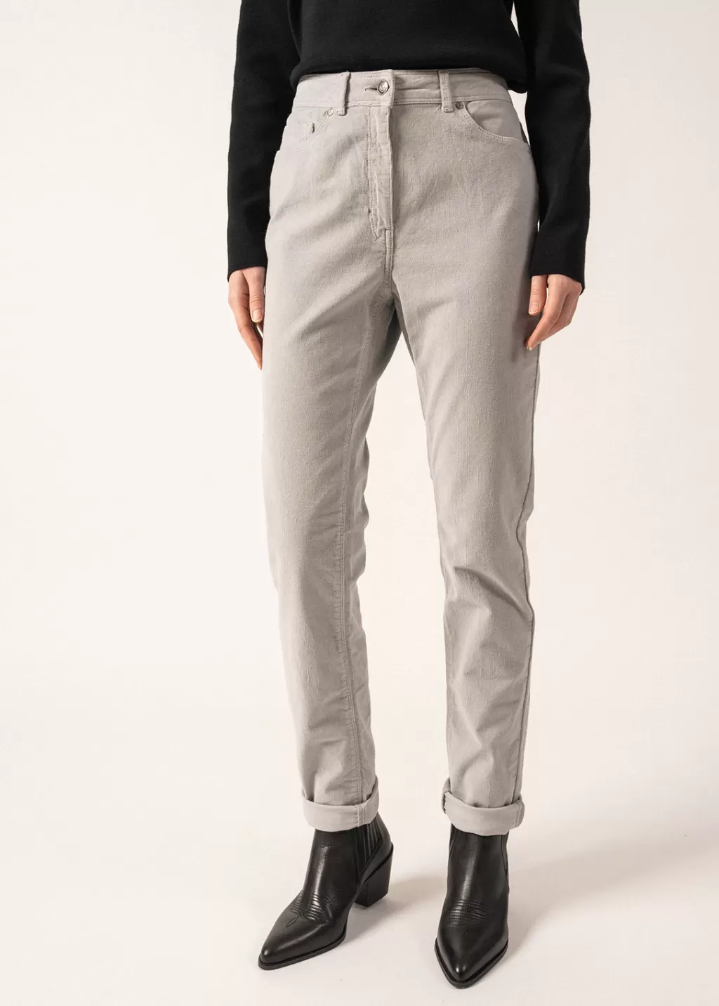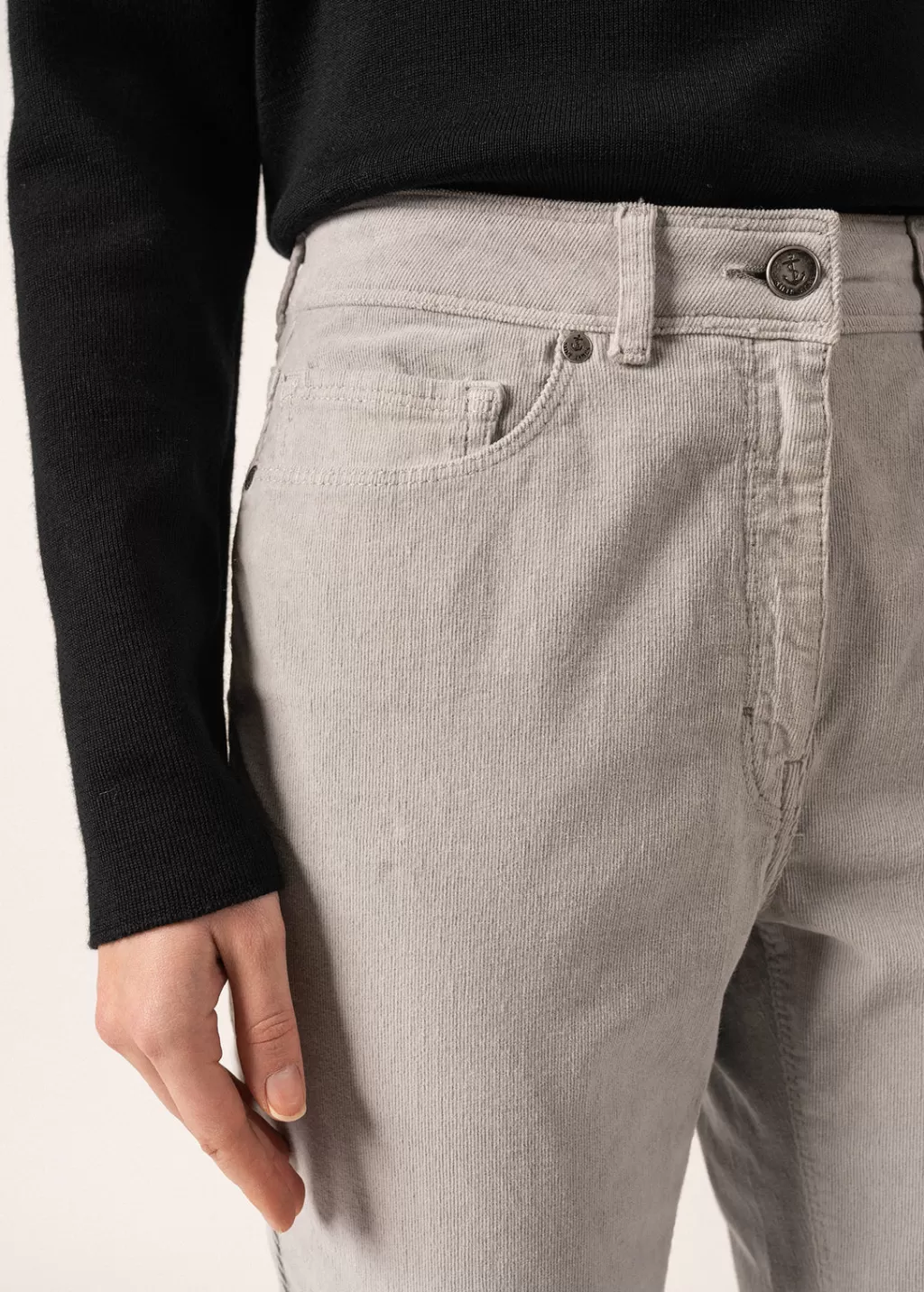High waisted, 5 pocket trousers in striped velvet. Slanted back pockets. Bottom of pockets in striped poplin. Metal button with engraved anchor detail.- Velvet