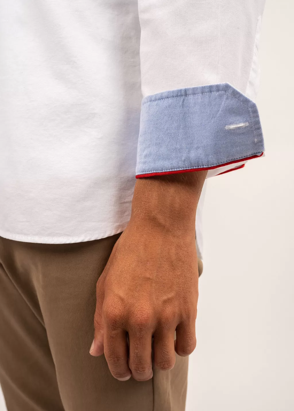 Plain dobby shirt with long sleeves. Button-down neck. Contrasting fabric : collar and inside cuffs. Chest pockets.