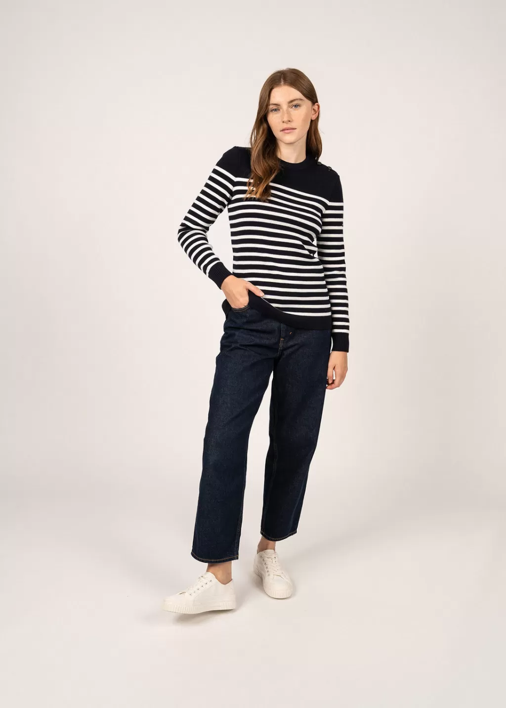 Feminine version of our timeless Rochefort, this sailor wool jumper is knitted in our Ateliers in Saint-James. For more comfort, it uses the fit of our Brégançon jumper, in soft Rochefort wool. On the shoulder, our classic buttoning is adorned with imitation horn resin buttons.
