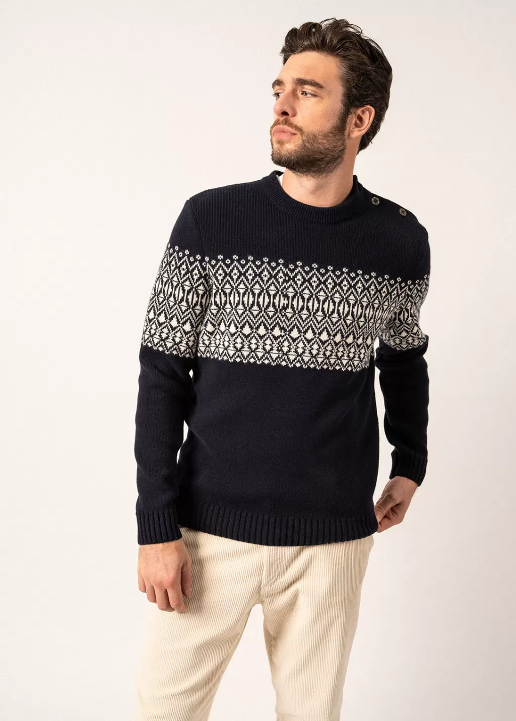 With its jacquard pattern, the Cancale Escapade jumper is a perfect variation of our iconic Cancale for winter! We love its two-tone pattern, as well as its classic features of the sailor jumper: round ribbed collar, shoulder buttoning, and 100% wool composition.- Sailor jumper