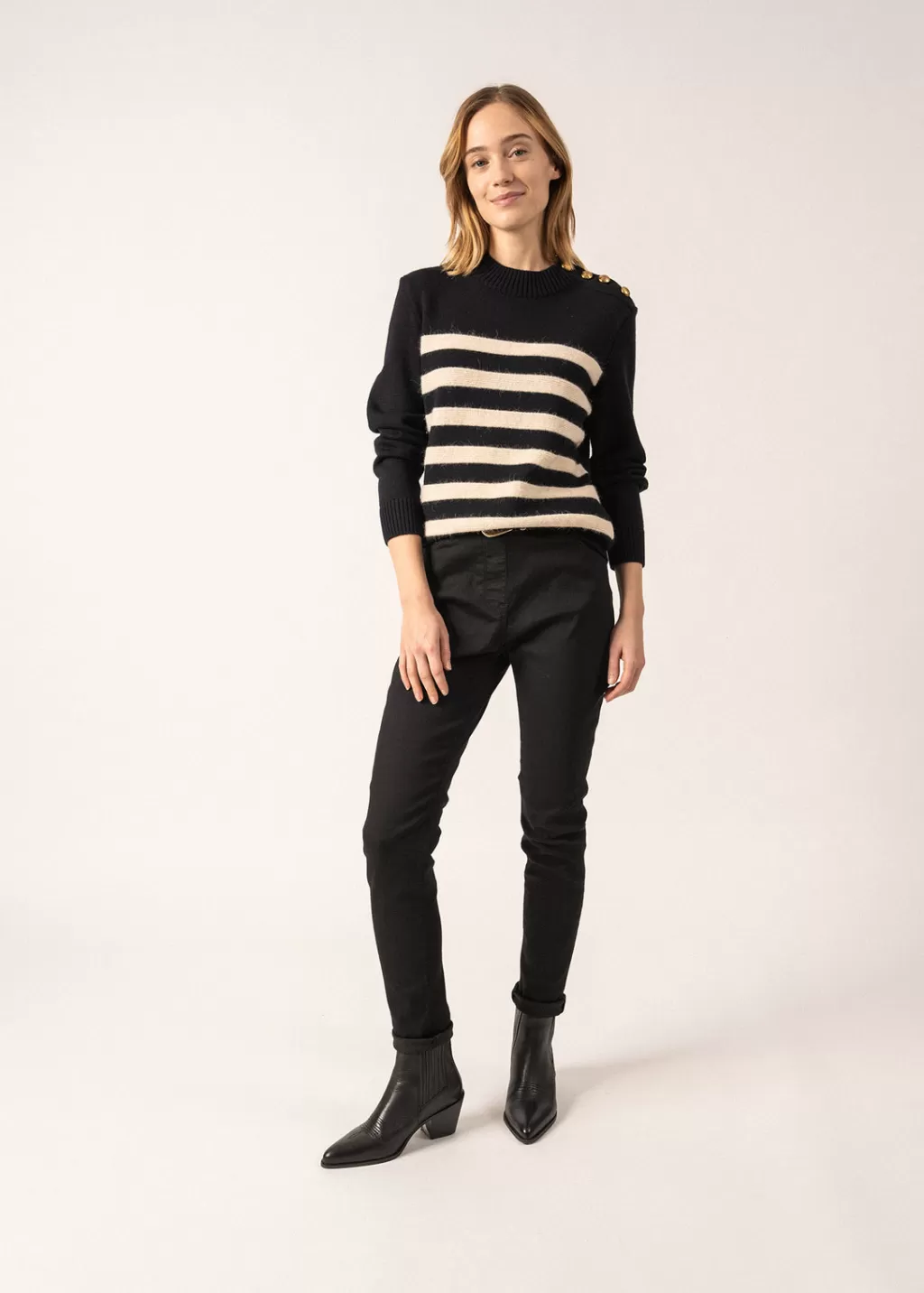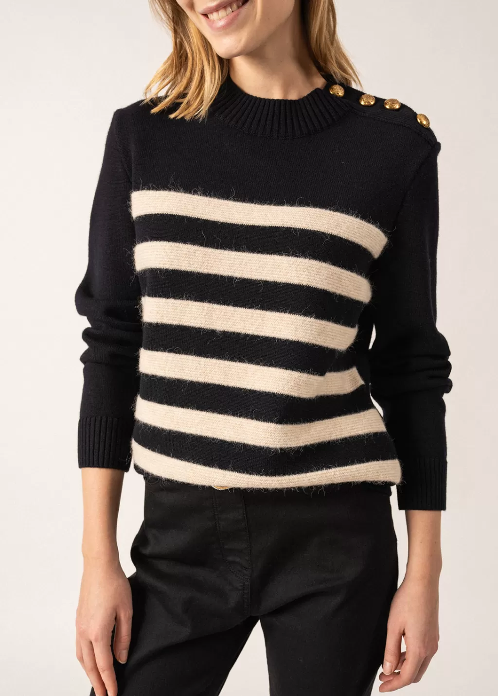 Inspired by our iconic sailor jumpers, the Gala jumper is a more feminine and festive version. We love its knitted stripes in fluffy wool, which add texture, as well as its gold buttons, elegant and feminine. A lovely piece for those wanting to vary from traditional sailor jumpers.- Striped jumper