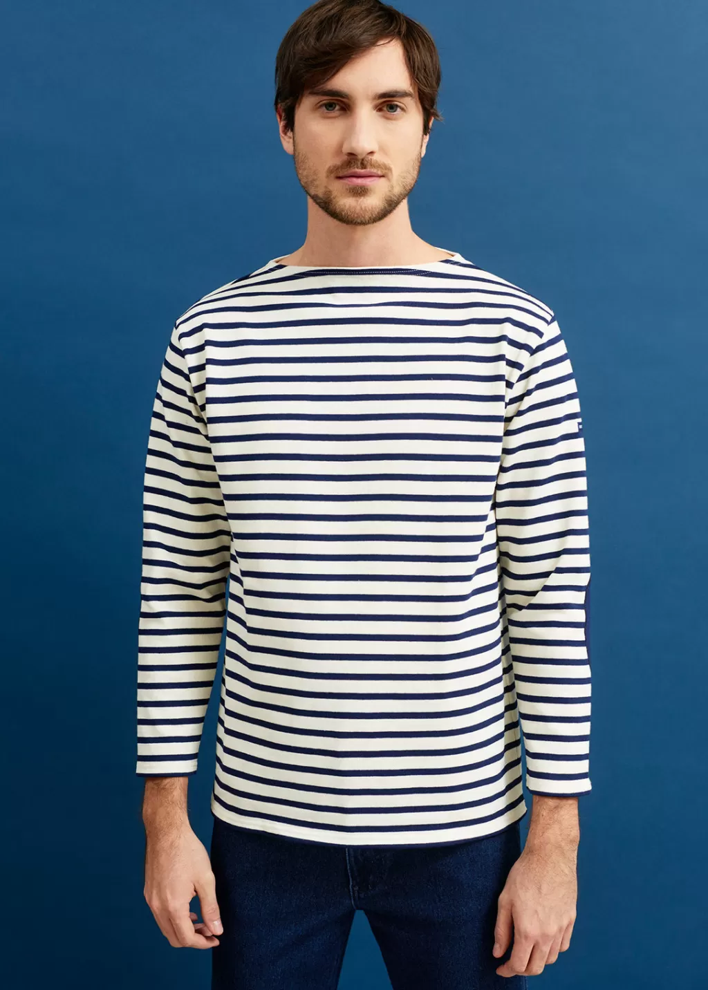 The Guildo striped sailor shirt has a delicate, rustic look with its carded cotton fabric and boat neck. This plain model has striped elbow patches. An iconic piece, for men and women.