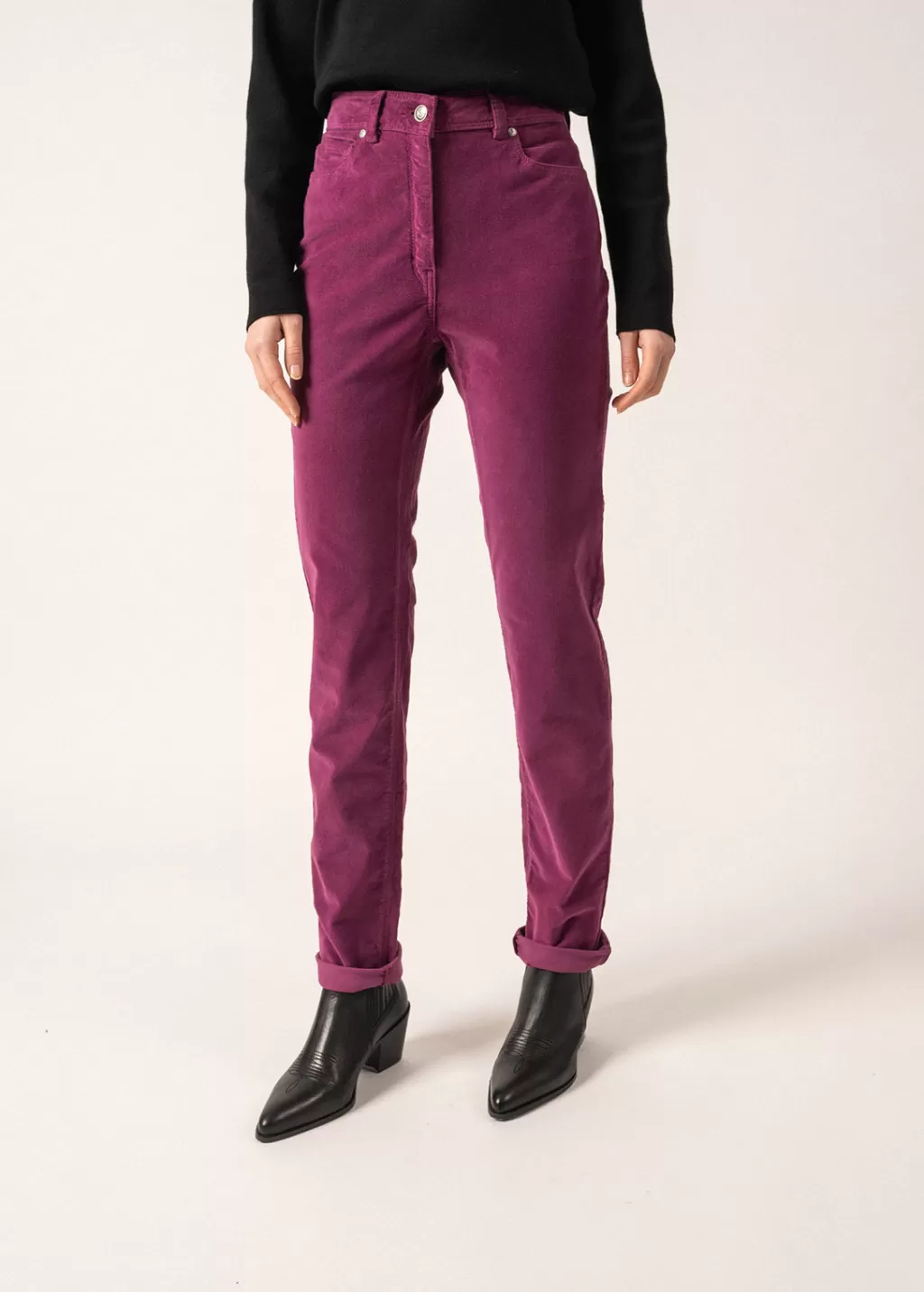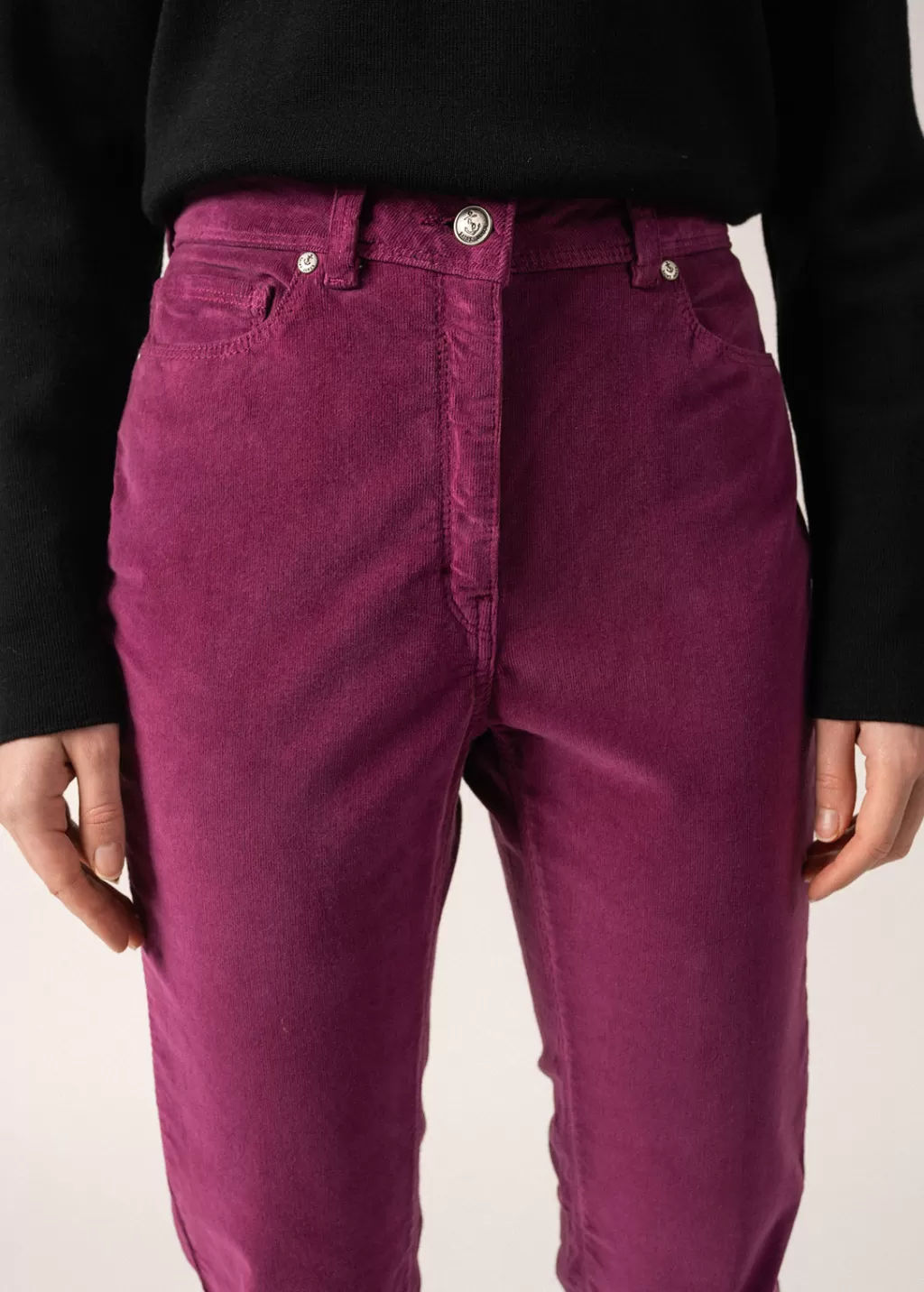 High waisted, 5 pocket trousers in striped velvet. Slanted back pockets. Bottom of pockets in striped poplin. Metal button with engraved anchor detail.- Velvet