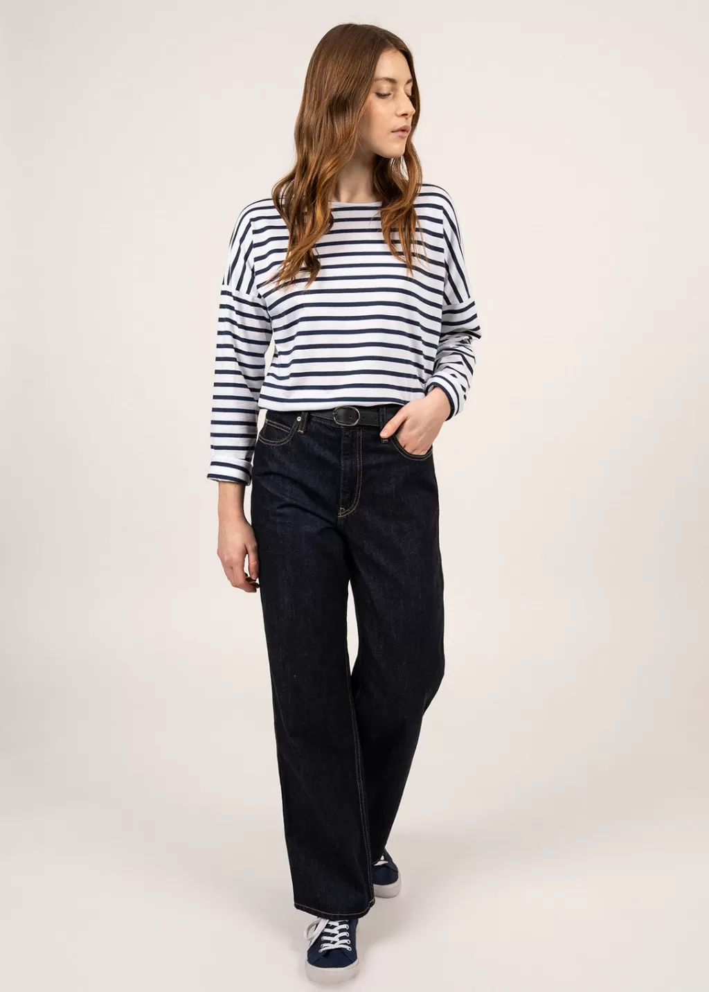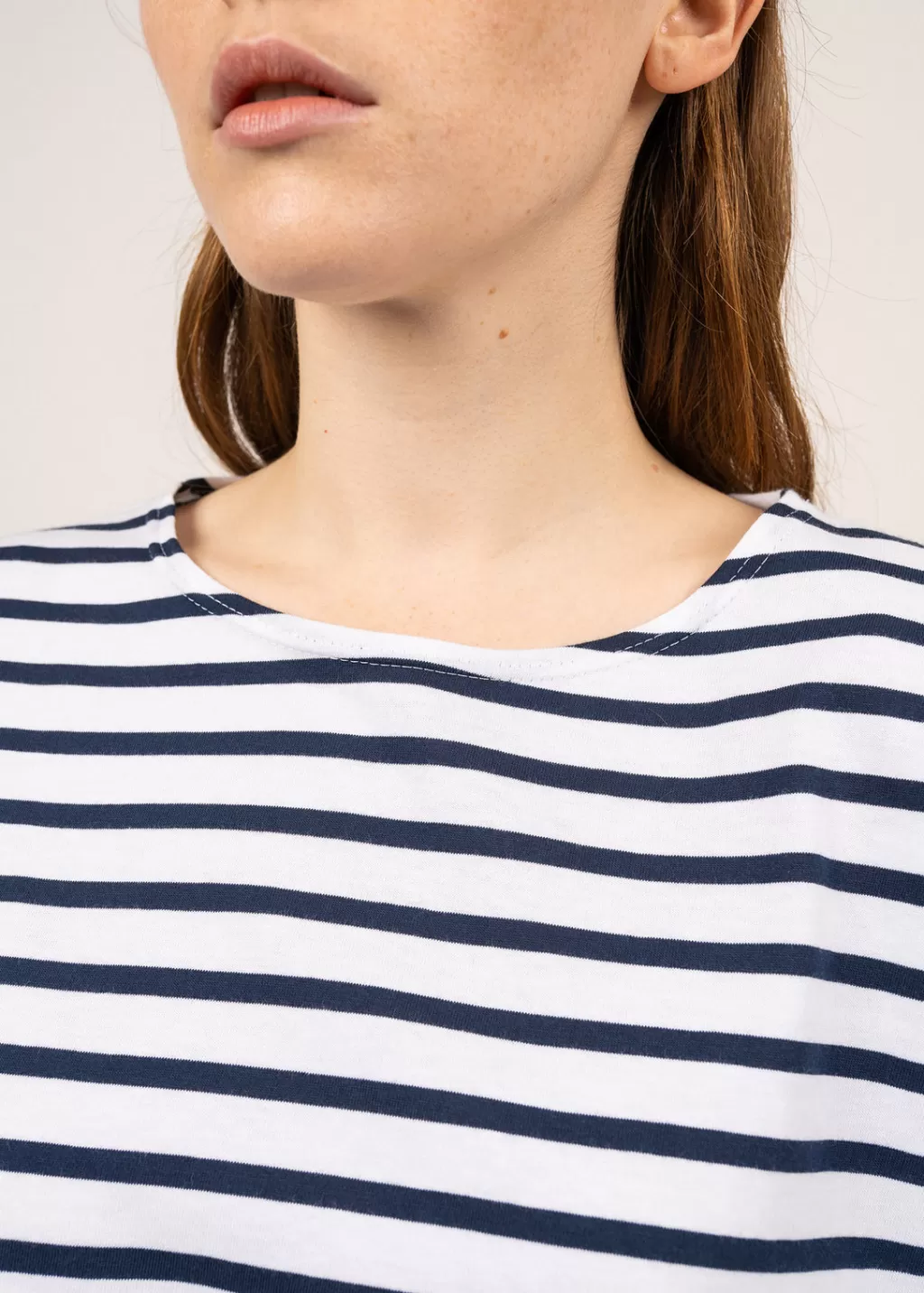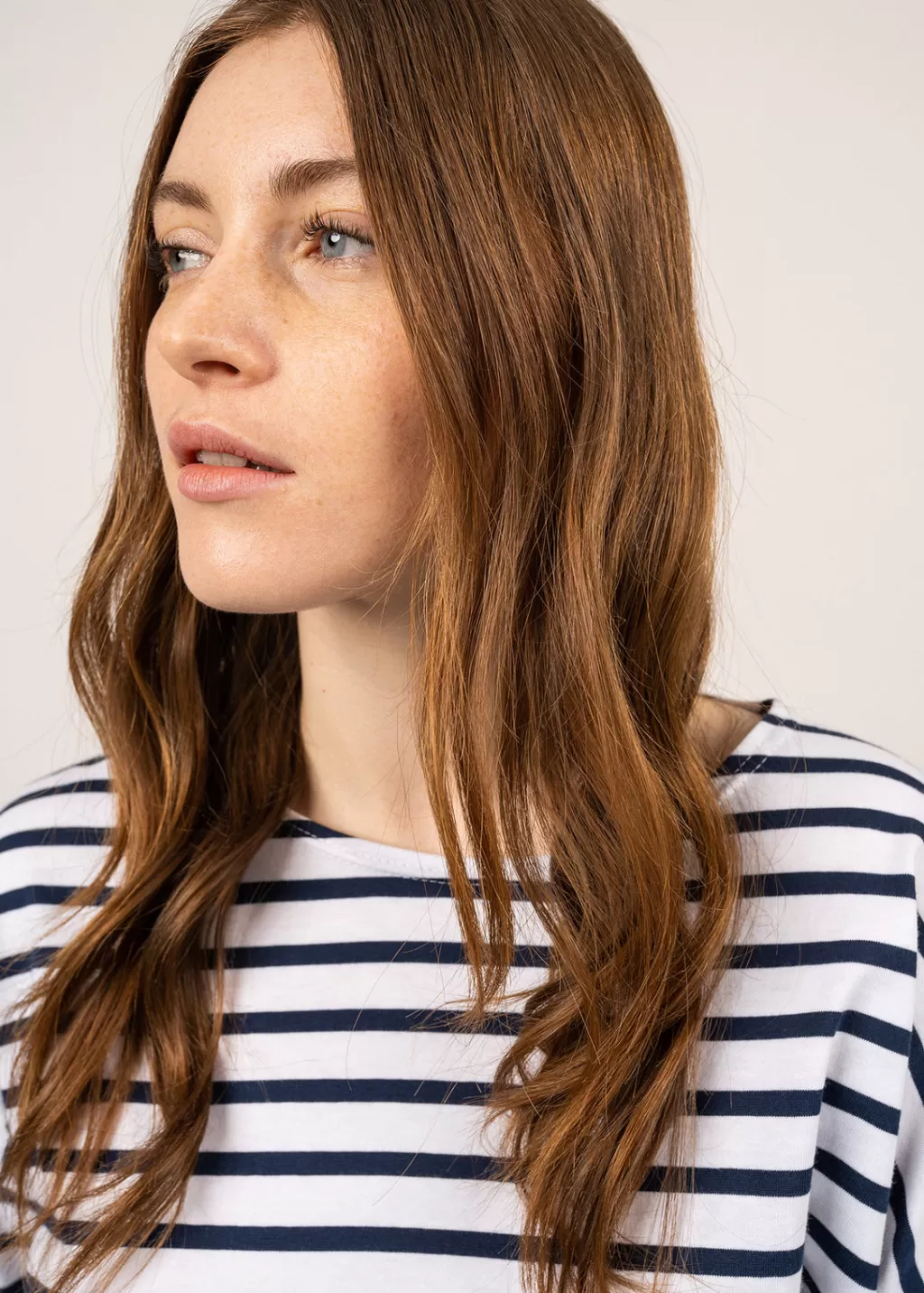 Modern and casual, the Minquiers Drop sailor striped shirt is inspired by our iconic Minquiers. This design features a dropped shoulder, which brings volume and modernity. Perfect for those looking for a comfortable piece, with a larger fit.- Jersey