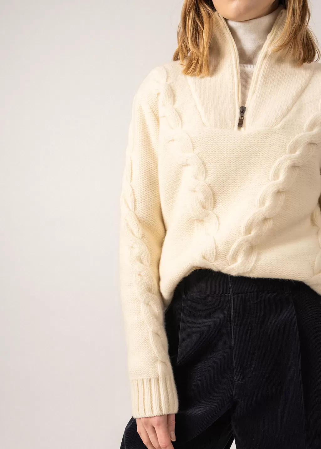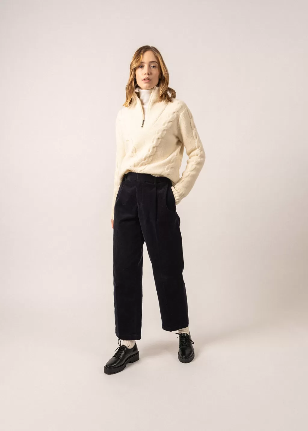 With its trucker collar and cropped volume, the Aberdeen jumper is trendy and modern. We love the detail of its cable knit on the body, which adds dimension to the design. Knitted in wool, it is warm and breathable, ideal for cold winter days.