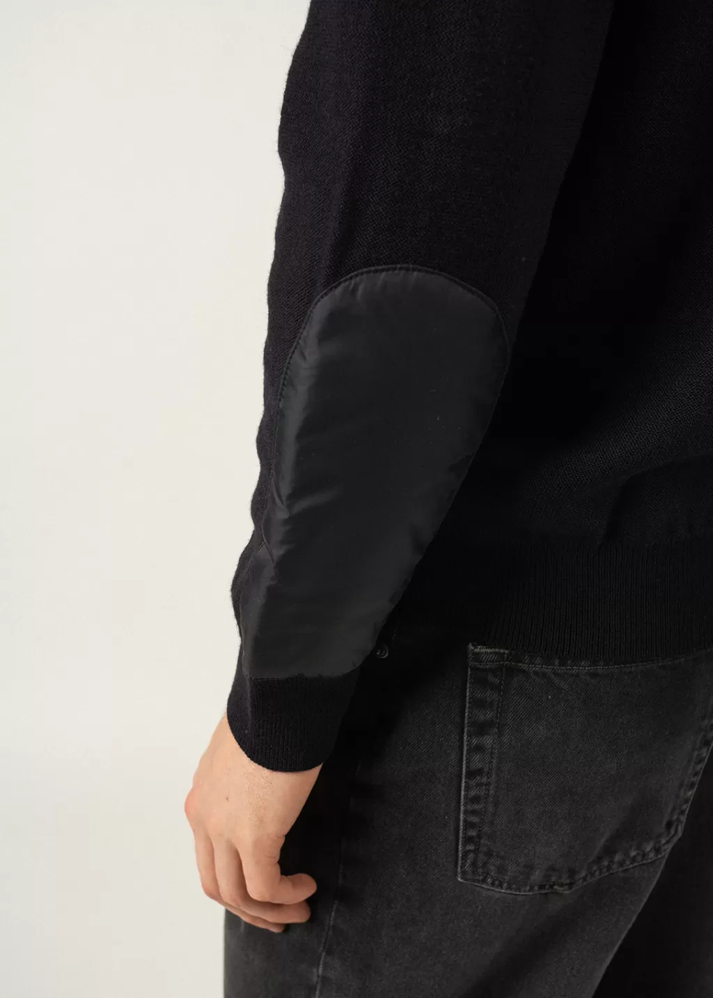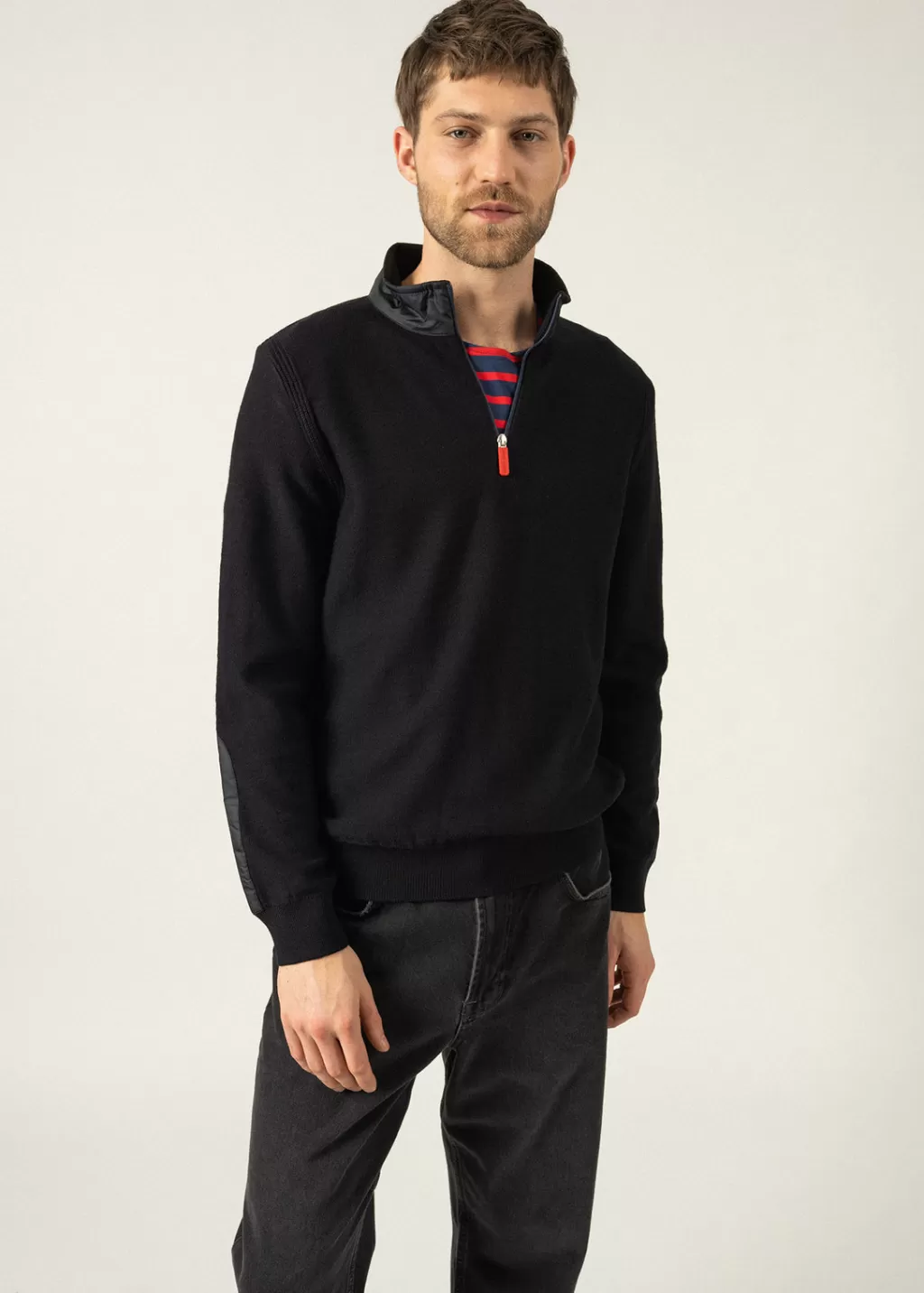 With its high neck and composition blending wool, TEFLON acrylic and canvas yokes, the Pomeroy jumper is a classical jumper, with technical inspirations. Its comfort fit makes it comfortable to wear, and its rib trim on cuffs and lower body add a casual touch.- Canvas patch on forearm